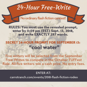 The third chance to qualify to compete in the October TUFFest Ride event during the 2018 Flash Fiction Rodeo at Carrot Ranch ended yesterday at midnight. If you missed this free-write, you have more chances to enter. You can enter more than once. Next qualifying free-writes will reveal secret prompts: September 19, 2018 (12:00 am – 11:59… Continue reading Flash Fiction Entry #3: Cool Water